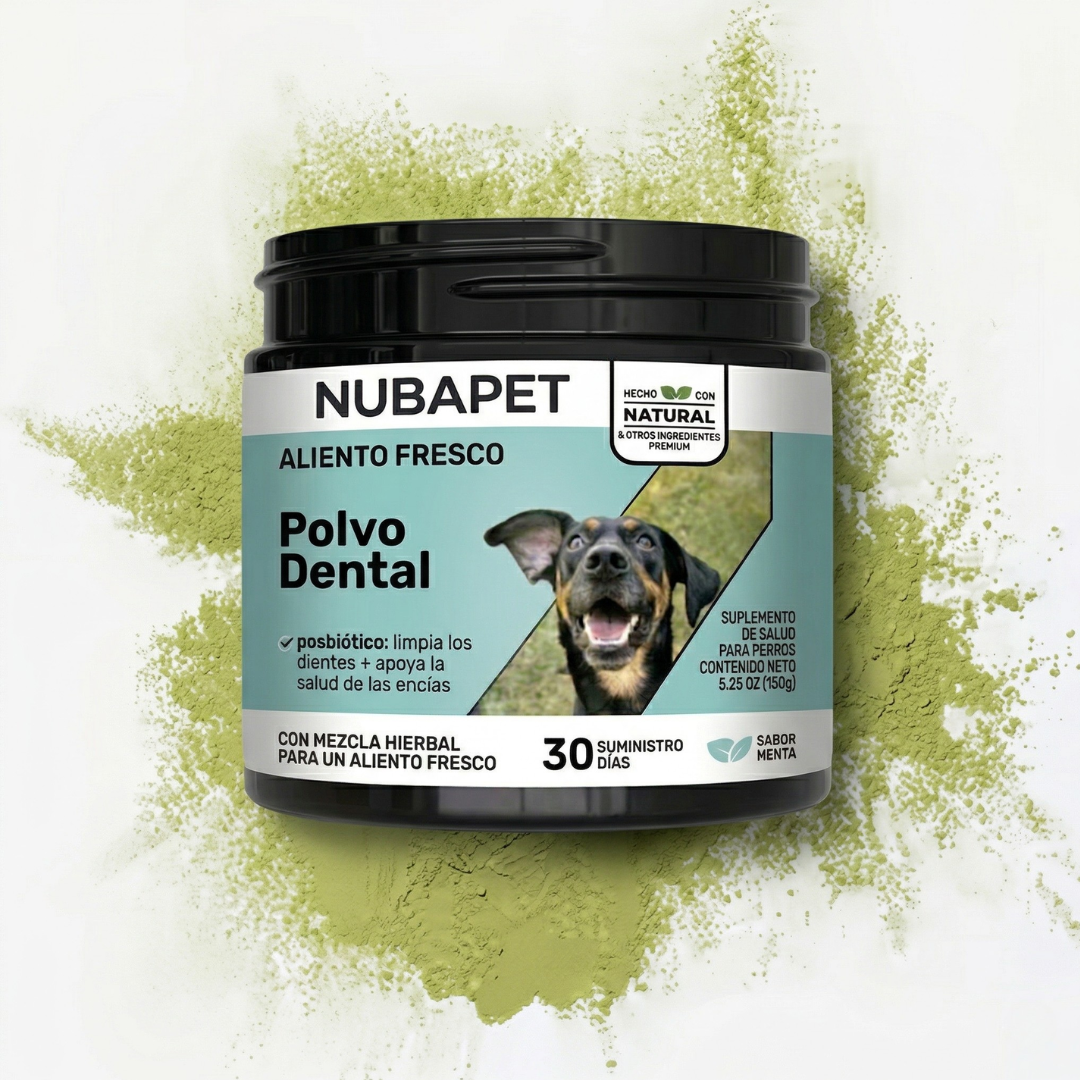 El polvo dental Nubapet® Advanced de Nubapet. facilita la limpieza dental en casa. Este innovador polvo combate la acumulación de sarro y ayuda a reducir el mal aliento en los perros.
